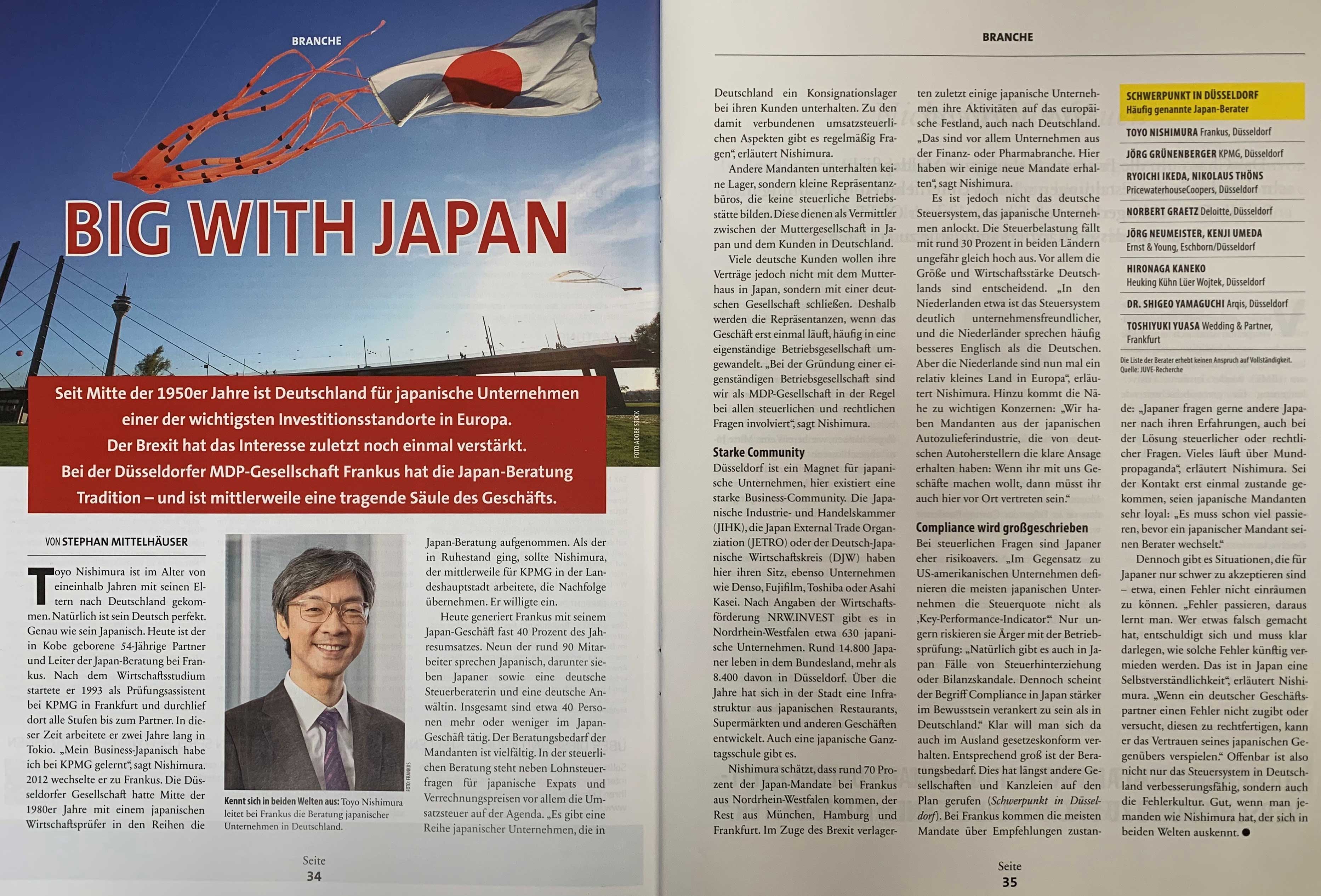 Toyo Nishimura studierte Volkswirtschaftslehre an der J-W-Goethe Universität (Dipl.-Volkswirt) in Frankfurt am Main. Im Jahre 1993 trat er in die Bankenprüfungsabteilung im Bereich der Wirtschaftsprüfung bei KPMG in Frankfurt am Main ein. Im Jahre 2000 erfolgte eine Dienstsitzverlagerung nach Düsseldorf und die Erlangung des deutschen Wirtschaftsprüfertitels. Herr Nishimura befand sich in den Jahren 2005 bis 2007 auf einer Entsendung zur japanischen Schwestergesellschaft von KPMG in Tokio. Nach seiner Rückkehr nach Düsseldorf und der Beförderung zum Partner entschloss er sich im Jahr 2012 zum Eintritt in die Sozietät Frankus als Partner. Herr Nishimura berät in den Bereichen Audit, Tax und Legal vornehmlich japanische Mandanten im internationalen Kontext.